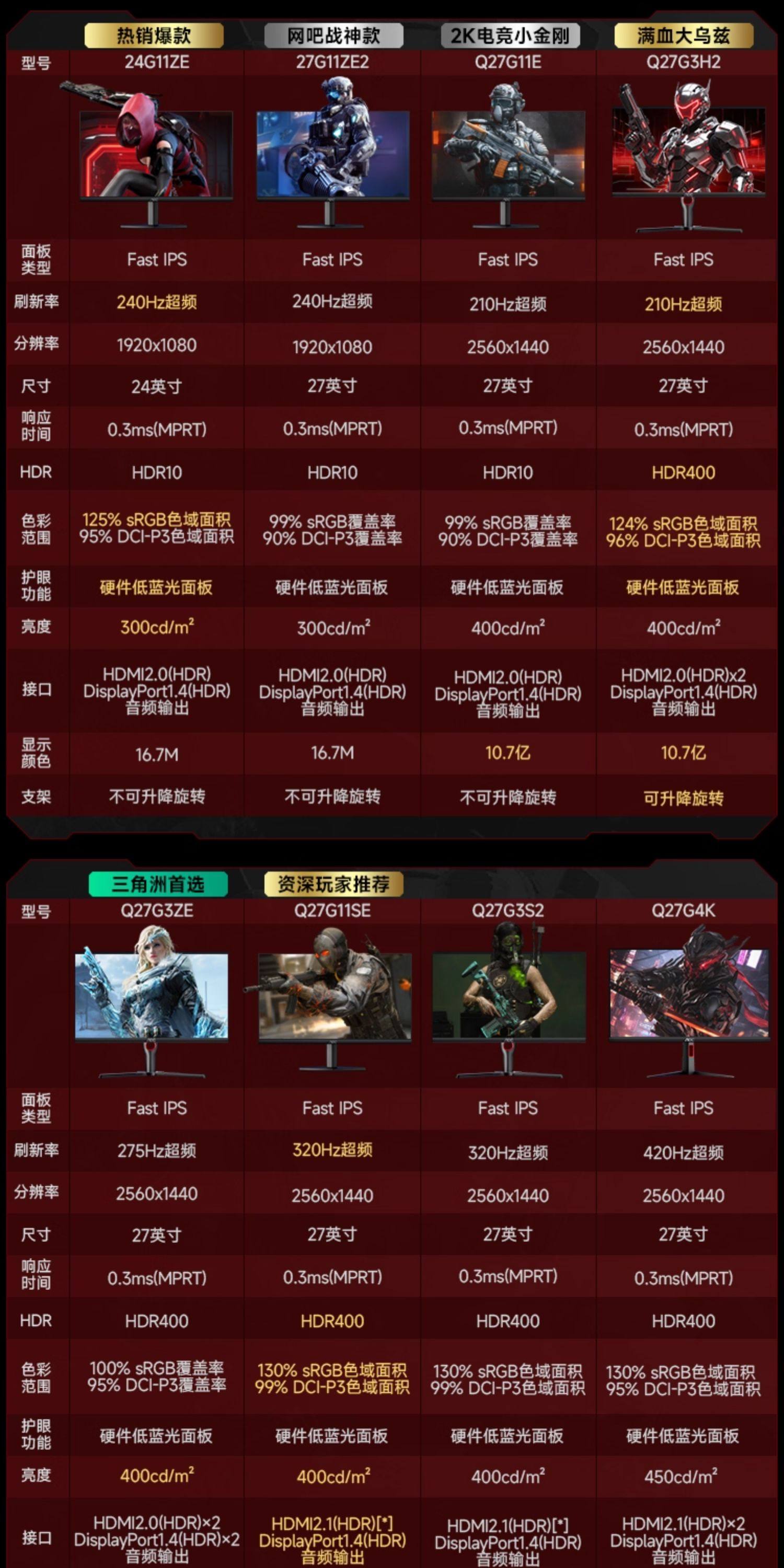 -----以下24英寸电竞系列-----,【FPS经典款】24英寸/Fast IPS/1K/240Hz超频/硬件低蓝光,【高刷FPS推荐】24G11ZE/24英寸/FastIPS/1K/240Hz超频/硬件低蓝光,【入门电竞】24G50F/24英寸/FastIPS/1K/原生144Hz/色彩六轴调节,【2K新款】Q24G50F/24英寸/IPS屏/2K/原生144Hz/色彩六轴调节,25G50Z/24.5英寸/FastIPS屏/1K/260Hz超频/硬件低蓝光/色彩六轴调整,【咨询享优惠】25G40SNE/24.5英寸/FastVA屏/1K/300Hz超频/HDR400/色彩六轴调整,【新款高刷】25G40SE/24.5英寸/FastIPS屏/1K/310Hz超频/HDR400,【硬件低蓝光】25G4S/24.5英寸/FastIPS/1K/310HZ超频/可升降旋转,【三角洲推荐】Q25G40SE/24.5英寸/FastIPS/2K/320Hz超频/硬件低蓝光,Q25G4S/24.5英寸/FastIPS/2K/300Hz原生/硬件低蓝光/可升降旋转,【瓦罗兰特推荐】25G4K/24.5英寸/FastIPS/1K/420Hz超频/可升降旋转,-----以下27英寸1K电竞系列-----,【硬件低蓝光】27G11ZE2/27英寸/IPS屏/1K/240HZ超频/0.3ms响应,(shai图返40❗)27G11ZE3/27英寸/IPS屏/1K/260HZ超频/0.3ms响应,【咨询享优惠】27G50F/27英寸IPS屏/1K/原生144Hz/六轴调色,-----以下27英寸2K电竞系列-----,【硬件低蓝光】27英寸/FastIPS屏/2K/180HZ,【2K爆款电竞】Q27G11E升级款/27英寸/FastIPS屏/2K/210HZ超频/硬件低蓝光,Q27G40E/27英寸/FastIPS屏/2K/180HZ,【2K颜值款】Q27G40E白色/27英寸/FastIPS屏/2K/180HZ,【满血升级版】Q27G3H2/27英寸/FastIPS/2K/210Hz超频/升降旋转,【雅典白】Q27G4/WS白色27英寸/FastIPS屏/2K/200HZ/可升降旋转,-----以下27英寸2K高刷电竞系列-----,【满血大乌兹】Q27G3ZE/27英寸/IPS屏/2K/275HZ超频/可升降旋转,【咨询享25】Q27G11SE/27英寸/FastIPS屏/2K/320HZ超频/可壁挂 【硬件低蓝光】,(shai图20)【40/50显卡推荐】Q27G3S2/27英寸/FastIPS屏/2K/320Hz超频/升降旋转,【巅峰电竞款】Q27G4K/27英寸/FastIPS屏/2K/400HZ/可升降旋转【硬件低蓝光】,【咨询享优惠】Q27G40ZE/WS/27英寸/FastIPS屏/2K/260Hz超频/硬件低蓝光,Q27G40ZE/27英寸/FastIPS屏/2K/260Hz超频/硬件低蓝光,期待上新/拍下发鼠标垫