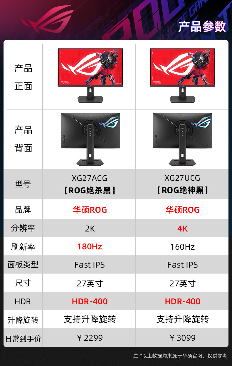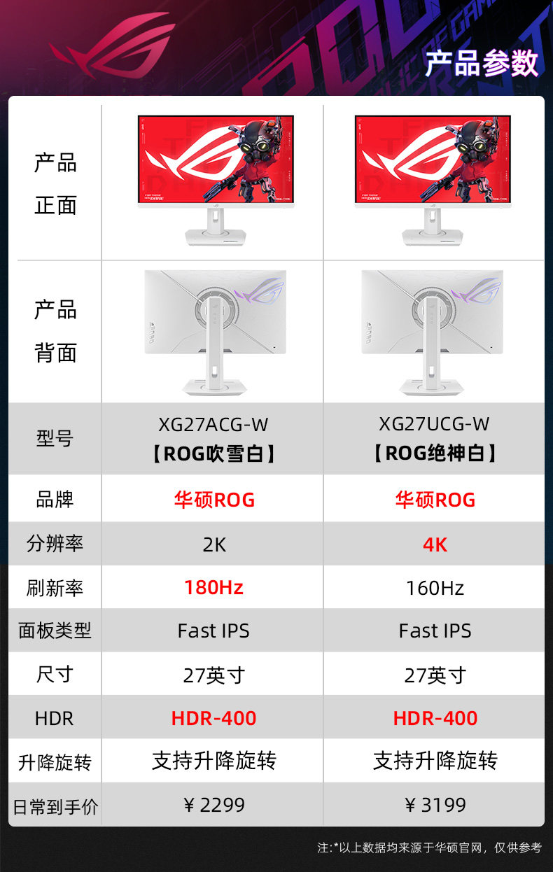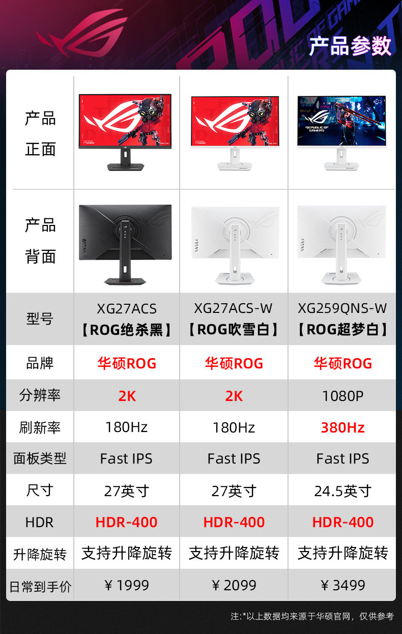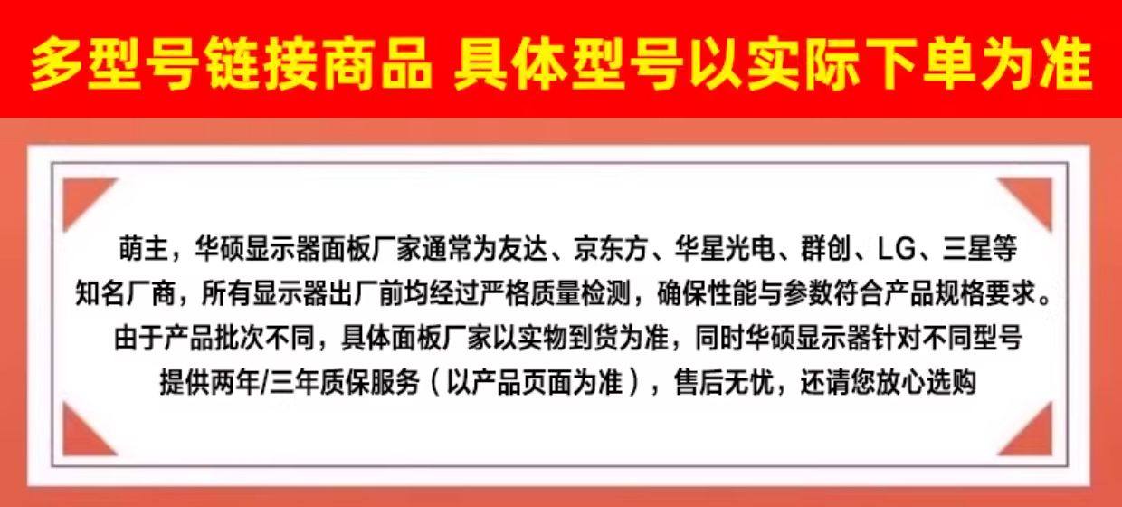 【收藏加购/享受优先发货】 【咨询客服有惊喜~】显示器详细参数请咨询客服! 【华硕小钢炮】27英寸/1080P/240Hz 【华硕小金刚】⭐27英寸/2K/210Hz ⭐【华硕小金刚MAX黑】27英寸/2K/210Hz 【华硕小金刚MAX白】27英寸/2K/210Hz 【华硕小金刚PRO黑】27英寸/2K/300Hz 【华硕小金刚PLUS黑】27英寸/2K/300Hz 【华硕小金刚PLUS白】27英寸/2K/300Hz 【华硕ROG绝杀黑无灯】27英寸/2K/180Hz 【华硕ROG绝杀黑有灯】27英寸/2K/180Hz 【华硕ROG绝杀黑有灯+机械臂T10黑色】 【华硕ROG吹雪白无灯】27英寸/2K/180Hz 【华硕ROG吹雪白有灯】27英寸/2K/180Hz 【华硕ROG吹雪白有灯+机械臂T10白色】 【华硕ROG绝杀黑无灯+机械臂T10黑色】 【华硕ROG吹雪白无灯+机械臂T10白色】 【华硕ROG绝杀二代黑无灯】27英寸/2K/255Hz 【华硕ROG绝杀二代黑有灯】27英寸/2K/260Hz 【华硕ROG吹雪白二代无灯】27英寸/2K/255Hz 【华硕ROG吹雪白二代有灯】27英寸/2K/260Hz 【华硕ROG绝神白色有灯】27英寸/4K/160Hz切换1K/320Hz) 【华硕ROG绝神白有灯+机械臂T10白】 【华硕ROG绝神黑有灯】27英寸/4K/160Hz切换1K/320Hz) 【华硕ROG绝神黑有灯+机械臂T10黑】 【ROG绝梦黑】24.5英寸/1K/380Hz 【ROG绝梦黑+机械臂T10黑色】 【ROG绝梦白】24.5英寸/1K/380Hz 【ROG绝梦白+机械臂T10白色】 【华硕ROG绝杀青春】24.5英寸/1K/310Hz 【华硕ROG绝杀青春+机械臂T10黑色】